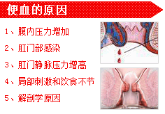 3、内痔:血色鲜红呈滴沥状或喷射状。排便中或便后出血,特点是大便出血时。由于质硬粪便擦破黏膜,或因排便时过于用力,血管内压力增高,以致曲张静脉血管破裂引起出血破裂引起出血。