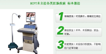 HCPT微创术适用范围及特点:临床上适用于痔疮、肛瘘、肛裂、肛周脓肿及息肉、纤维瘤等类肛肠疾病的检查治疗。具有操作简单、治疗、治疗结束自动报警、来炭化、血管闭合好、术中术后、病人等小优点,手术无任何风险。